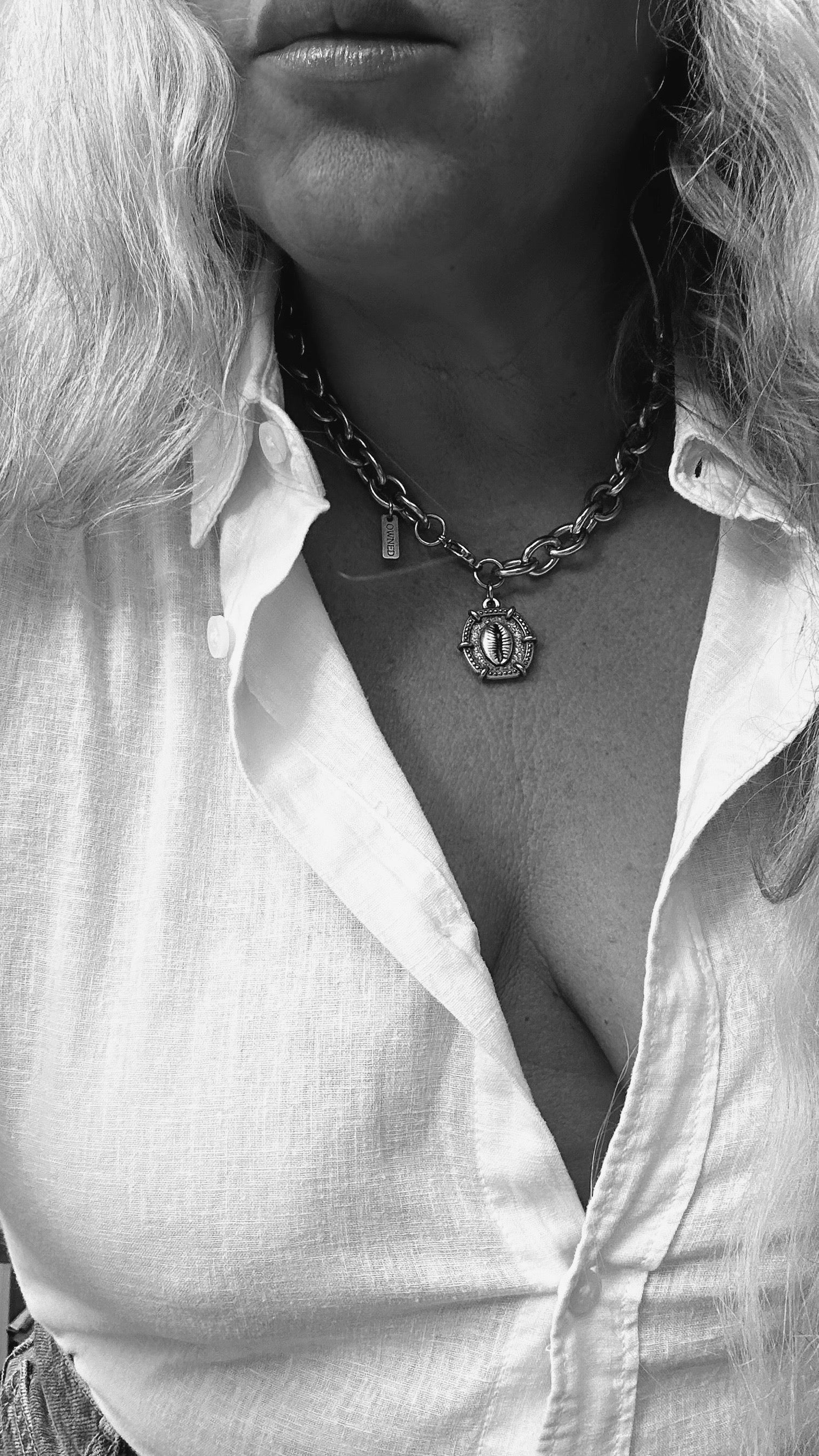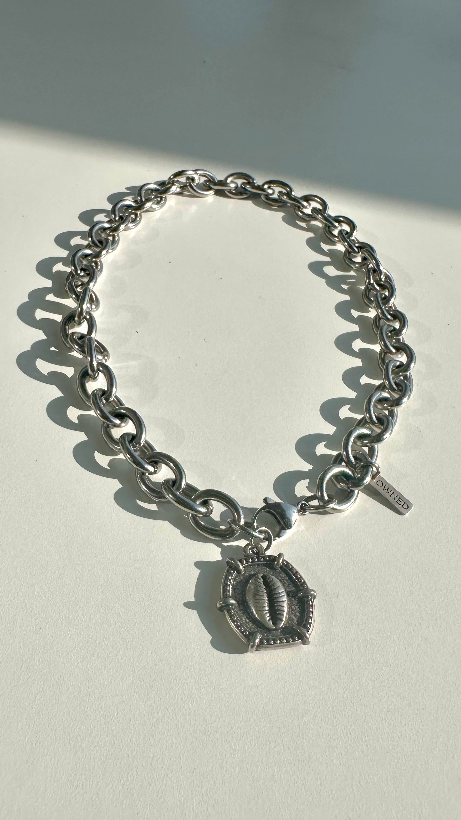 שרשרת יוניסקס עשויה חוליות צ’אנקיות עם סוגר קדמי שעליו תלוי תליון מטבע ובו מוטבעת קונכייה. שרשרת עם נוכחות חזקה שהיא שילוב מושלם בין וייב ימי-אקזוטי לבין טאץ’ רוקיסטי ואורבני. נראית מדהים על עור שזוף, עם חולצה פתוחה או שמלה מתנפנפת ברוח הים.